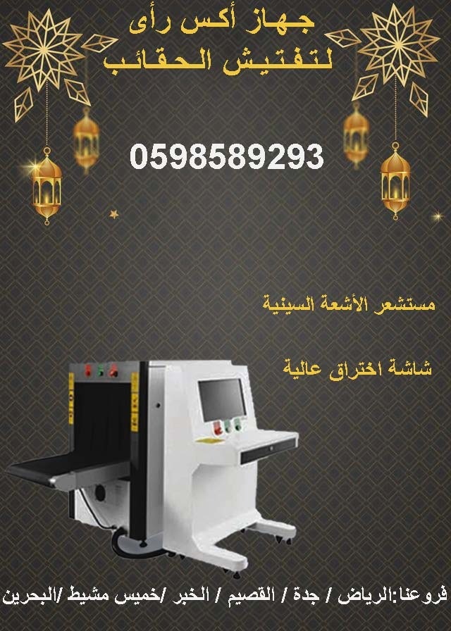 جهاز كشف الحقائب الاكس راي: عرض خاص وبسعر مناسب على أجهزة كشف الحقائب،والذى يعتبر بمثابة جهاز انذار ضد اى متعلقات خارجية داخل الحقائب حيث تستعمل في كل الأماكن والنوادي والشركات ومحطات المترو لزيادة الأمان، ويمكن الكشف من خلالها على الأسلحة المخبأة داخل الحقائب والمخدرات والعملات المعدنية.وله أحجام مختلفة،ولنا فروع في المملكة في الرياض وققصيم وجدة والشحن لجميع أنحاء المملكة، ولنا فروع في البحرين، وتوجد لدينا خدمات الصيانة والتركيب، للتواصل عبر الواتساب:0598589293
