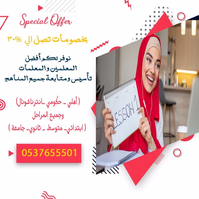 لدينا معلمات ومعلمين متابعة لجميع المواد تخصص وخبرة 0537655501